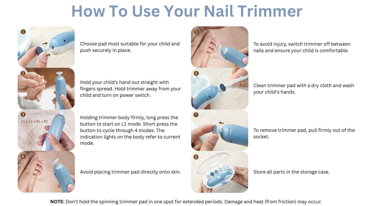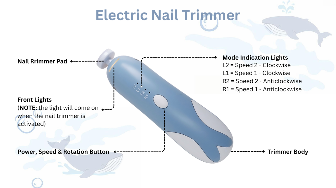 Our Nailcare Set has two rotation directions and speeds to suit your needs. It's whisper quiet and features soft LED lights for easy nighttime filing. Simply attach the trimmer pad suitable for your child's age and gradually file down their nails. The trimmer pads gently smooth your baby's nails without leaving sharp edges that may scratch their delicate skin. And best of all, the Friendly Whale Nail Care Set is suitable for everyone from newborns to mum and dad, making it the perfect gift for the whole family!