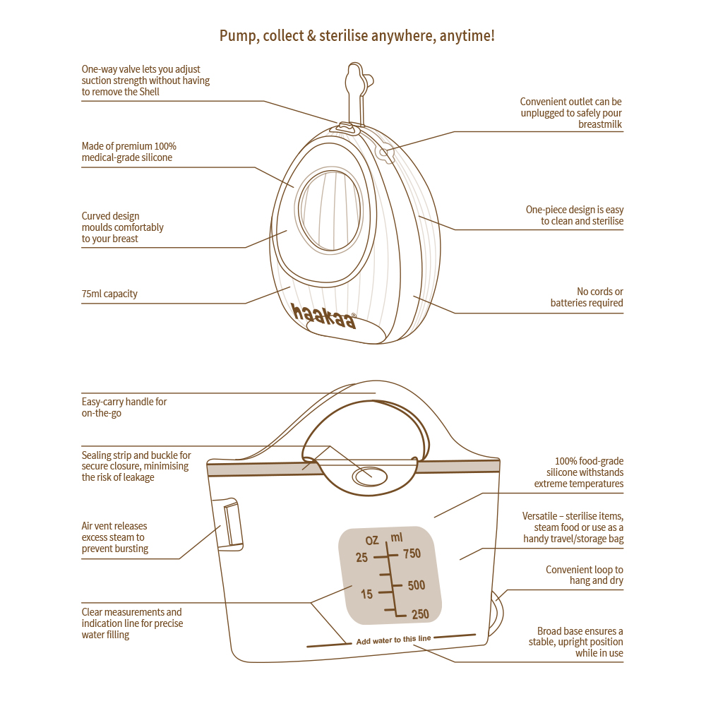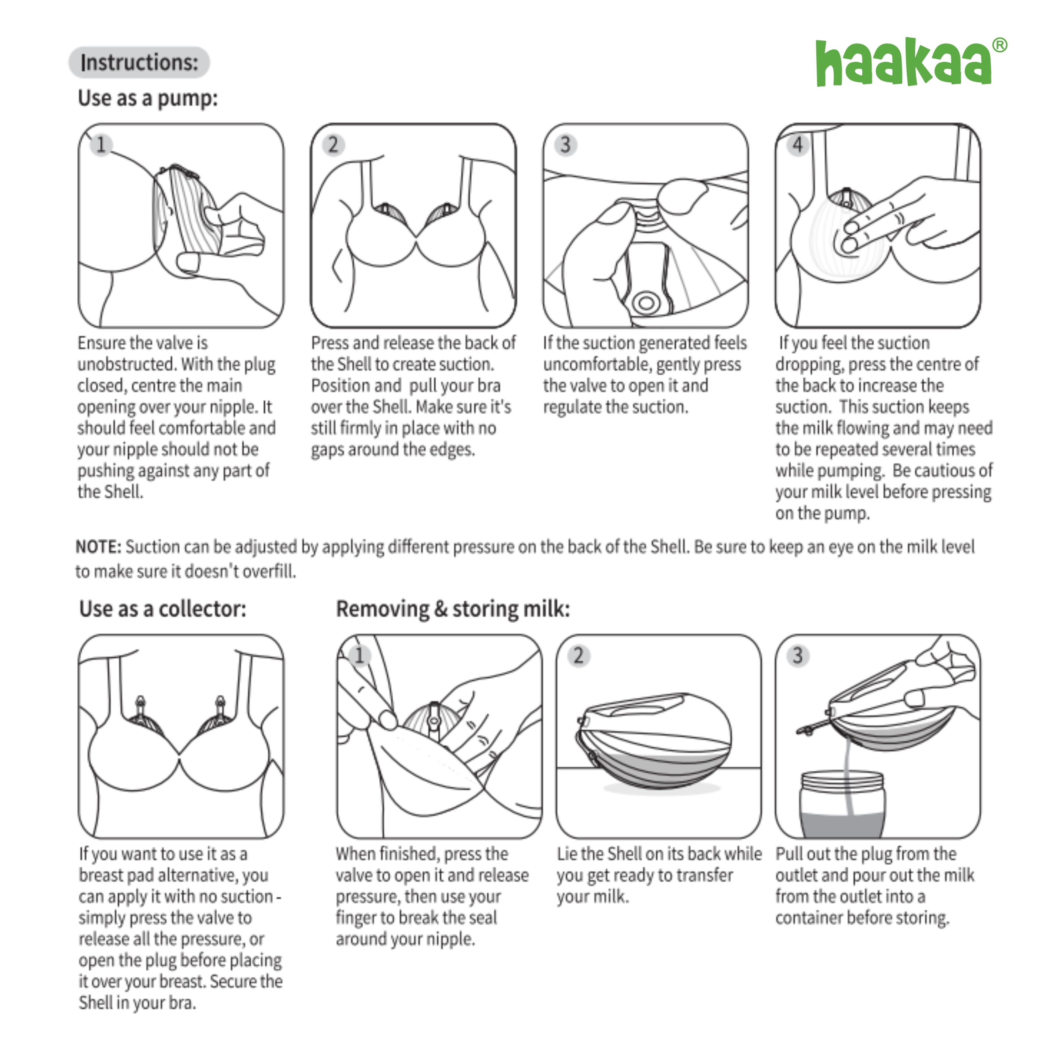 Breast pump,milk collector - why not both? We're introducing you to the Shell Wearable Silicone Pump,a convenient blend of our OG Silicone Breast Pumps and the Ladybug Milk Collector! This nifty little device acts as a wearable shell pump,making it ideal for those days you need to pump but have things to do. Simply press the back and attach it to your breast,pop your bra back on,and get on with your day! You can regulate the suction strength with a quick adjustment of the valve. On the other hand,if you just want to catch a bit of that leakage,pop out the plug so there's no suction,put the Shell into your bra,and passively collect what's leaking out already! It's a win-win for you,no matter your needs. The Shell lies flat on its back when it's time to be emptied,preventing any milk spills,and the easy-pour outlet lets you transfer your precious liquid gold into a bottle or storage container without any mess. Easy to use,easy to clean,the Haakaa Shell is the perfect option for mums who need both a pump and a collector.